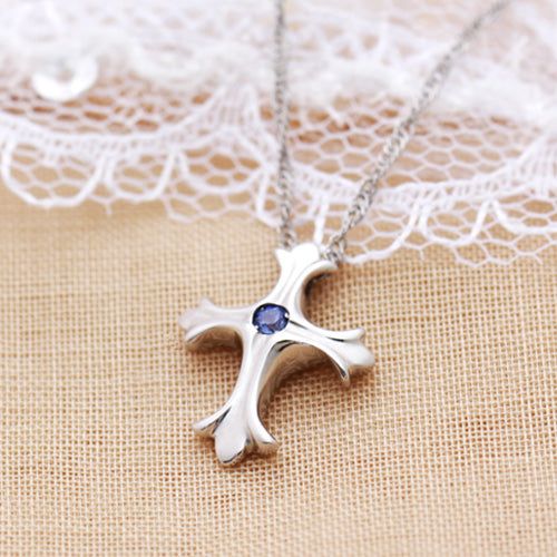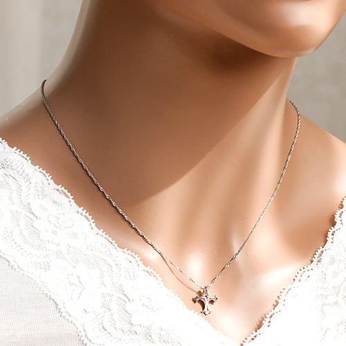 クラシカルな十字架のネックレスです。装飾的なラインのペンダント中央に誕生石が埋め込まれています。