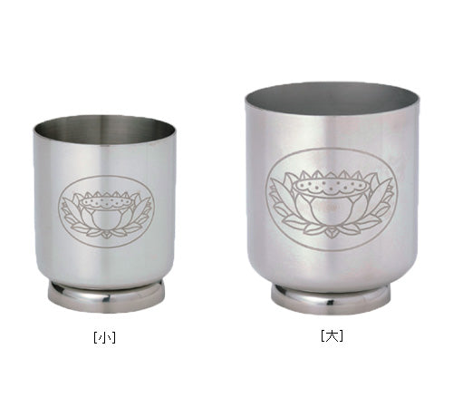お墓前にお供えする蓮の華が描かれたステンレス製の茶湯器。日本製