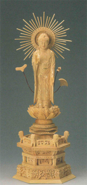仏像 本柘植 六角鬼面麒麟台座 【東立弥陀】 東型光背 眼入 (切金付) 4寸/4.5寸/5寸/6寸